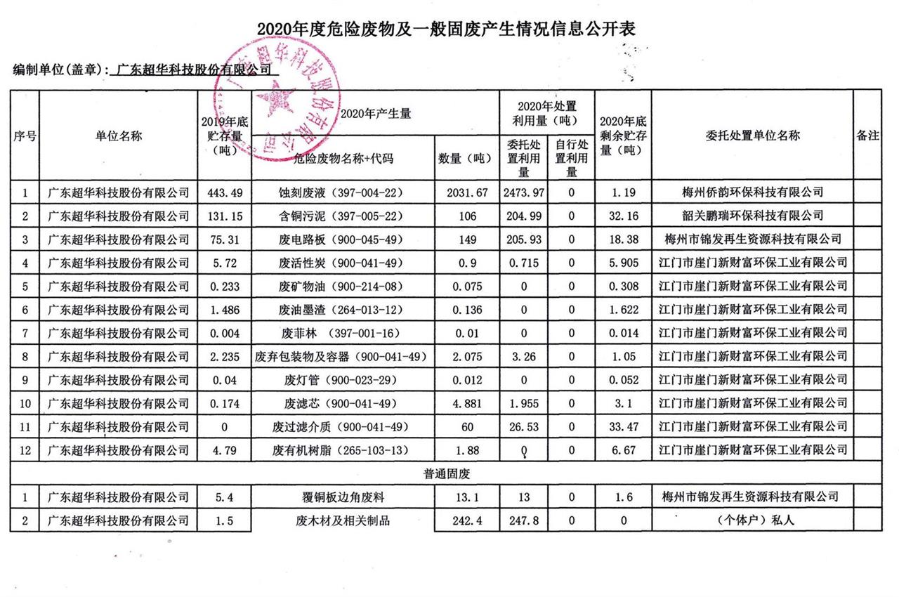 廣東超華科技股份有限公司2020年度固體廢物污染環(huán)境防治信息公示