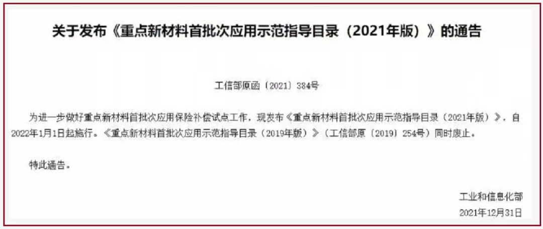 據(jù)工信部網(wǎng)站消息,為進(jìn)一步做好重點(diǎn)新材料首批次應(yīng)用保險(xiǎn)補(bǔ)償試點(diǎn)工作,工信部發(fā)布《重點(diǎn)新材料首批次應(yīng)用示范指導(dǎo)目錄(2021年版)》(工信部原〔2021〕384號(hào)),自2022年1月1日起施行?!吨攸c(diǎn)新材料首批次應(yīng)用示范指導(dǎo)目錄(2019年版)》(工信部原〔2019〕254號(hào))同時(shí)廢止。