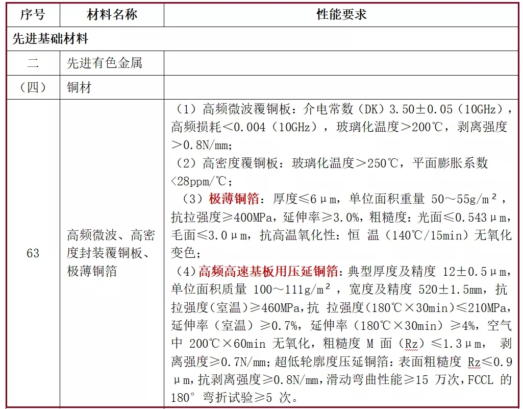 在工信部發(fā)布《重點(diǎn)新材料首批次應(yīng)用示范指導(dǎo)目錄(2021年版)》(簡(jiǎn)稱“指導(dǎo)目錄”)中,劃分為:包括了先進(jìn)基礎(chǔ)材料、關(guān)鍵戰(zhàn)略材料、前沿新材料三大類,共304種先進(jìn)新材料。與我們電子銅箔行業(yè)的先進(jìn)銅箔產(chǎn)品項(xiàng)目,有兩項(xiàng)被列入其中(在目錄表中的63序號(hào))。即“極薄銅箔”與“高頻高速基板用壓延銅箔”。此兩項(xiàng)先進(jìn)銅箔產(chǎn)品的主要性能見(jiàn)公布“指導(dǎo)目錄”的附表所列(見(jiàn)表1 )。