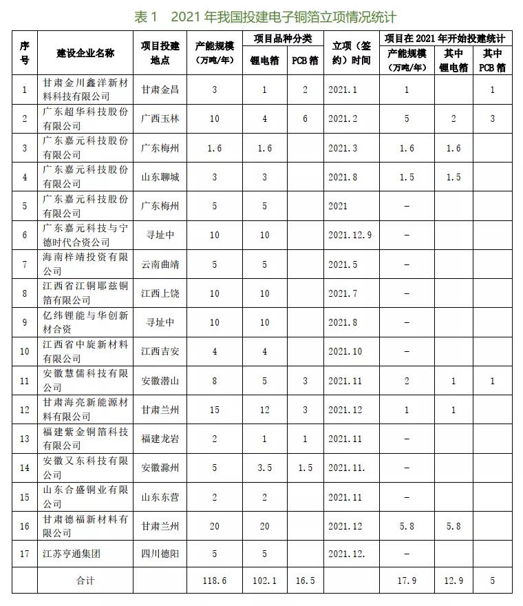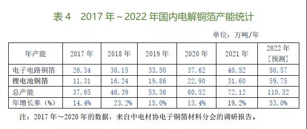 表3的統(tǒng)計數(shù)據(jù),是根據(jù)在2020~2021年開工建設(shè)的進度及計劃在2022年間實現(xiàn)投產(chǎn)的情況逐一調(diào)查(包括對30多家新投建銅箔廠家的問卷調(diào)查,并以此反饋意見為準)所得到的。