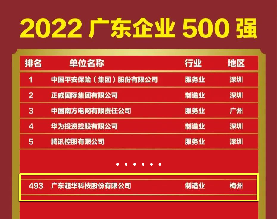 10月12日,廣東省企業(yè)聯(lián)合會(huì)、廣東省企業(yè)家協(xié)會(huì)在廣州發(fā)布《2022廣東500強(qiáng)企業(yè)發(fā)展報(bào)告》,廣東超華科技股份有限公司入選“2022廣東企業(yè)500強(qiáng)”!